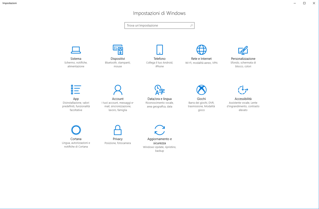 Ottimo siete entrati nelle impostazioni di Windows 10. Qui, come potete vedere, ci sono diversi menu che ci permettono di accedere a tanti altri sottomenu.