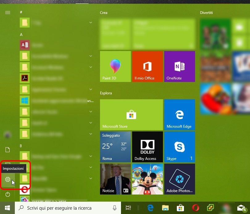 Per prima cosa dobbiamo sapere che il SO ha un menu tutto suo dove è possibile esplorare diverse funzionalità. Per accedere a questo menu basta cliccare su sull’icona di Windows posta in basso a sinistra del nostro monitor, quello che una volta si chiamava START. Successivamente dovremo cliccare sull’ingranaggio posto appena sopra il tasto di accensione e spegnimento del nostro PC.