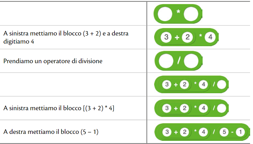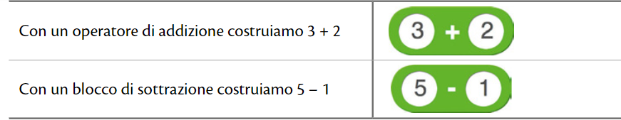 Selezioniamo la categoria “Operatori” e vediamo che i primi quattro blocchi di questa categoria sono in grado di eseguire le quattro operazioni fondamentali dell’aritmetica.Ognuno di questi blocchi contiene due caselline tonde, che accettano quindi solo valori numerici.Realizzare una somma con Scratch è facile. 7 + 2, per esempio, viene realizzato con il blocco di Figura 10.1.Nelle caselline bianche, oltre a digitare numeri interi o con decimali (separati dal punto), possiamo trasportare dentro altri operatori.Costruiamo ora un’espressione più complessa, per esempio [(3 + 2) * 4] / (5 – 1).