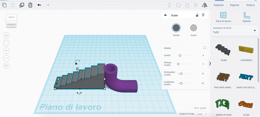 Pensiamo sempre al nostro scivolo. Per realizzare la scala per accedere alla parte alta dello scivolo possiamo accostare un parallelepipedo di diversa altezza oppure possiamo utilizzare direttamente una forma avanzata. La forma delle scale, infatti, è presente nella selezione ampia dei Generatori di forme. Per accedere a questo menu bisogna cliccare su “Tutti” nella sezione Generatore di forme. Come si può notare in questa sezione sono presenti diversi tipi di forme, la scala ad esempio è nella pagina 2.