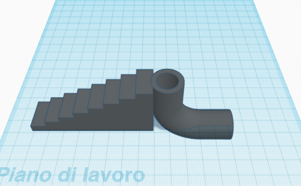 Clicca sulle scale e trascinale sul piano di lavoro e allineale al tubo. Se serve aumenta il numero dei gradini nelle diverse opzioni. importante deselezionare l’opzione Mobile per creare un solido che arrivi fino alla base del piano di lavoro. A questo punto unisci le due forme così da ottenere una forma unica: il tuo scivolo a tubo!
