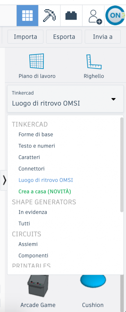 Fino ad ora abbiamo utilizzato i solidi presenti nella sezione “forme di base”, adesso proviamo ad utilizzare il generatore di forme. puoi accedere a questa sezione cliccando sul menu a tendina sotto ai comandi Piano di Lavoro e righello e selezionando la voce sotto al titolo Generatori di forma.