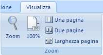 È possibile ingrandire o ridurre (Zoom) le dimensioni della visualizzazione del testo digitato.Questa operazione non ha effetto sulle caratteristiche del documento (la stampa non cambia), ma solo sulla presentazione dello stesso sullo schermo, nella finestra di Word.Il comando Zoom è accessibile attraverso il gruppo Zoom della scheda Visualizza della Barra multifunzione oppure mediante il dispositivo Zoom posto sulla Barra di stato a destra.Il gruppo Zoom della scheda Visualizza:?) 100% visualizza il documento nelle sue dimensioni reali.?) Una pagina visualizza una intera pagina del documento.?) Due pagine visualizza due pagine.?) Larghezza pagina visualizza l’intera larghezza del documento.?) Zoom permette di immettere la percentuale di zoom desiderata.